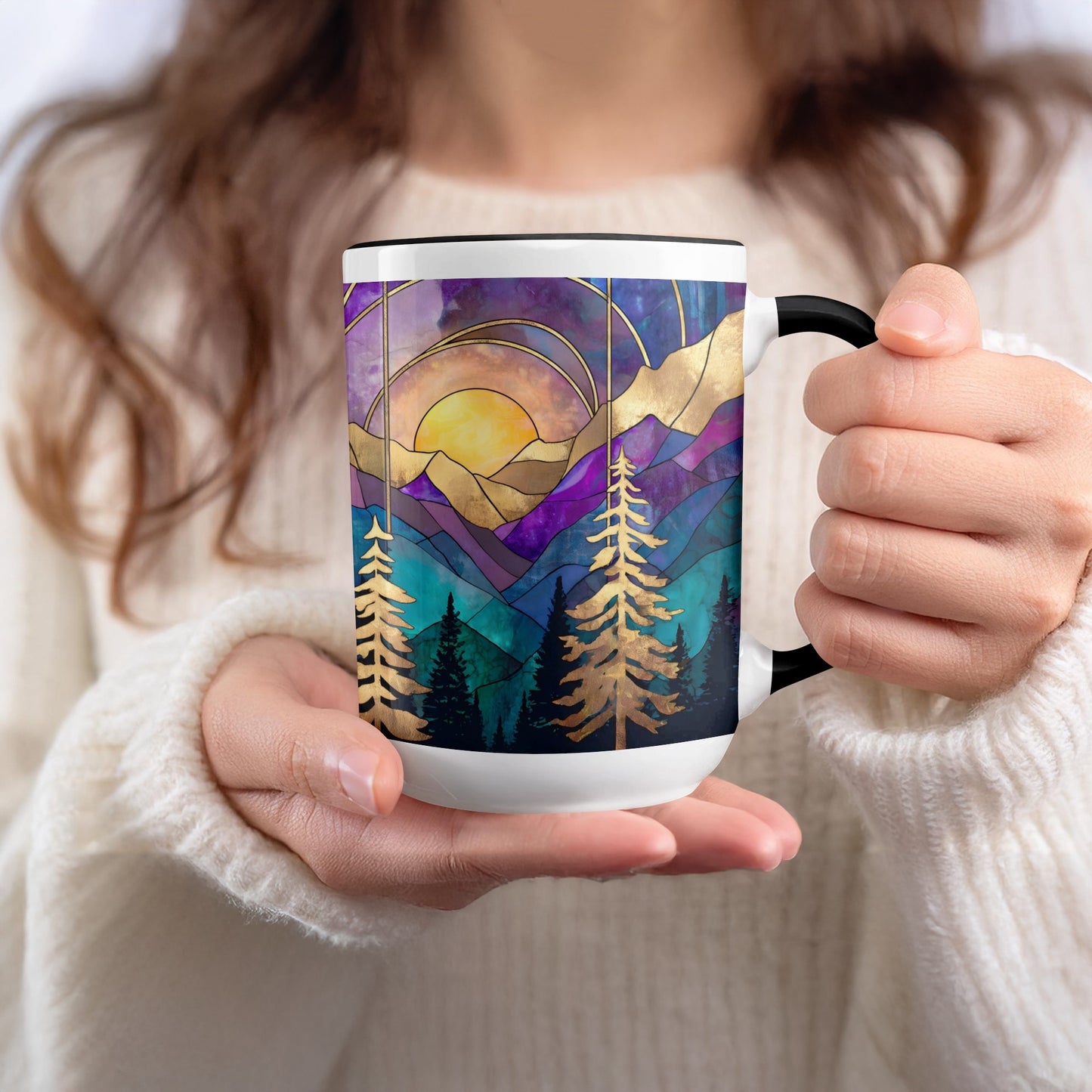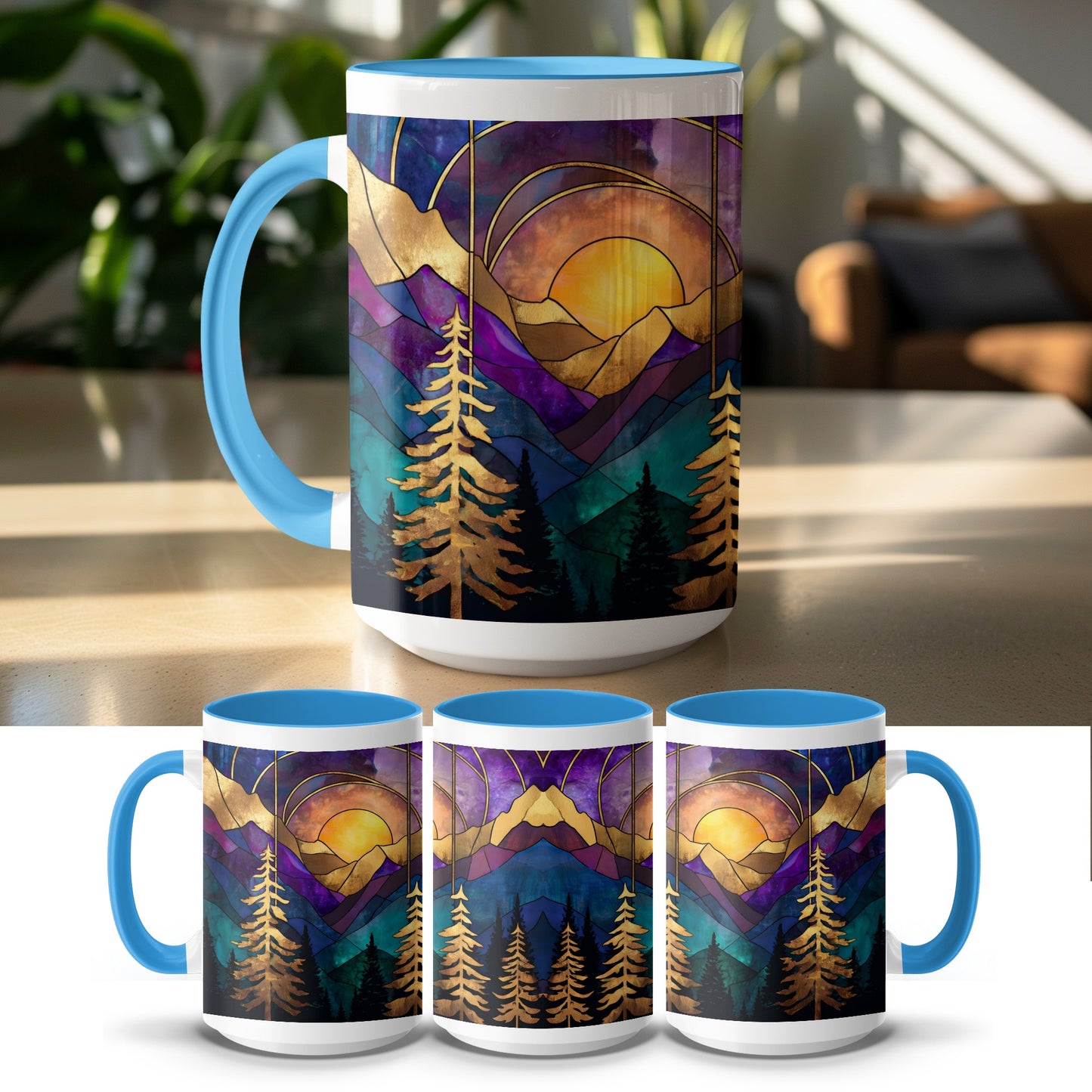 Elevate your designs with this stunning stained glass themed design showcasing a colorful sunset over a mountain range with golden outlined trees. A perfect touch for creatives.