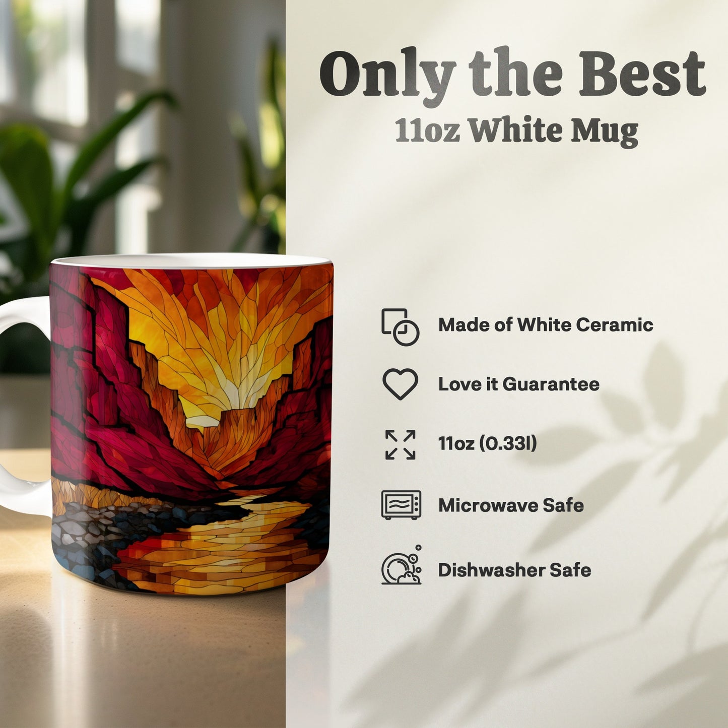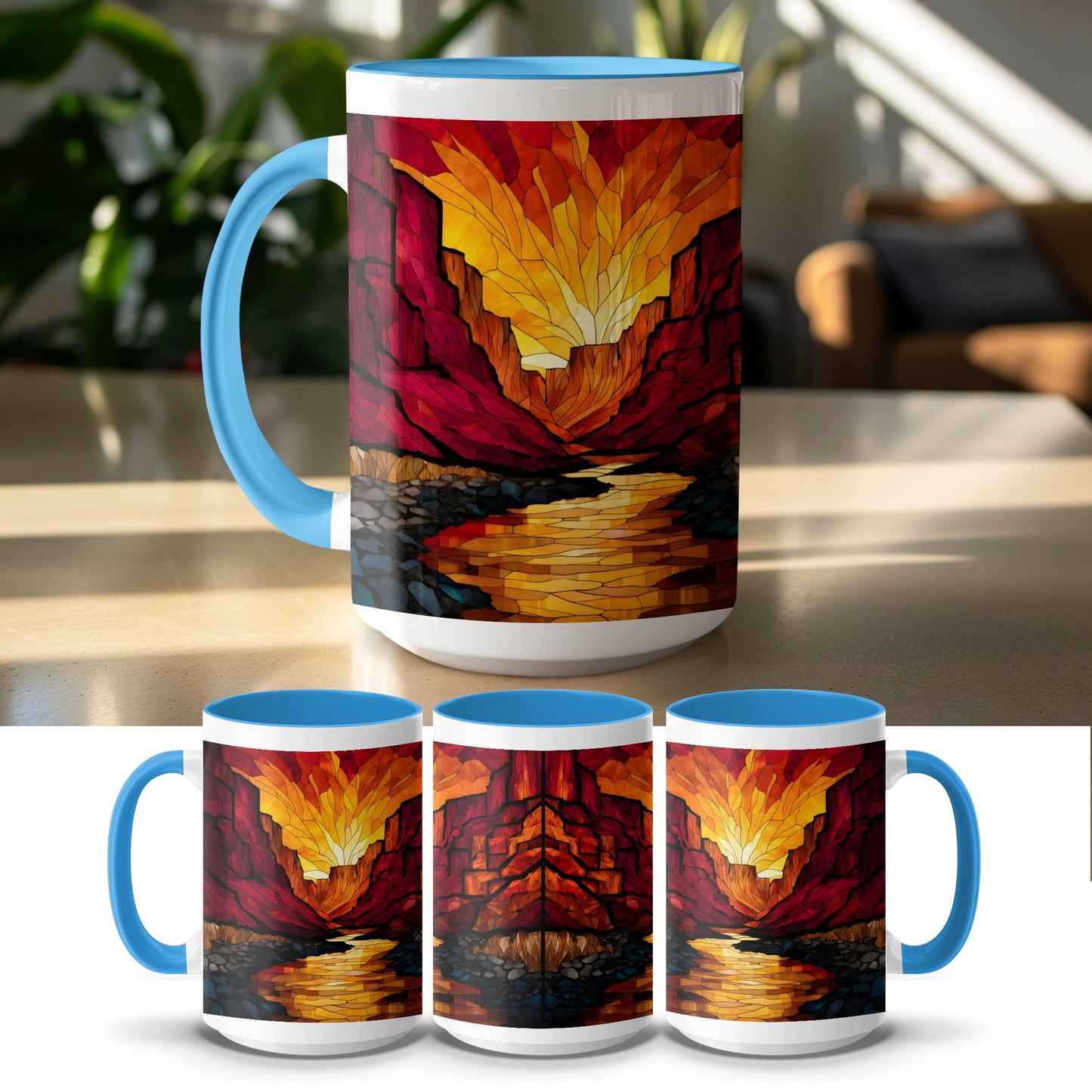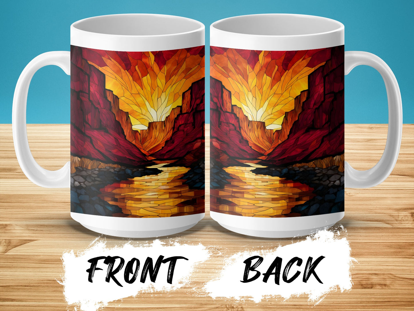 Discover the beauty of a stained glass sunset over a canyon with our vibrant digital art. Perfect for adding warmth and an artistic touch to any space with this high-quality print.