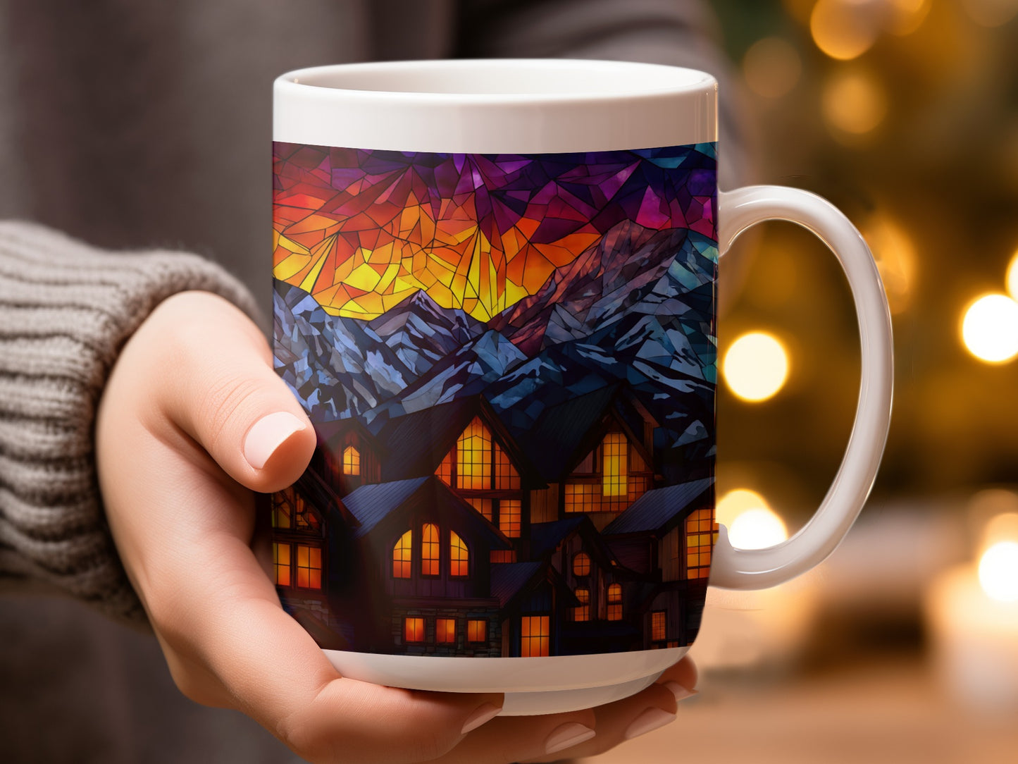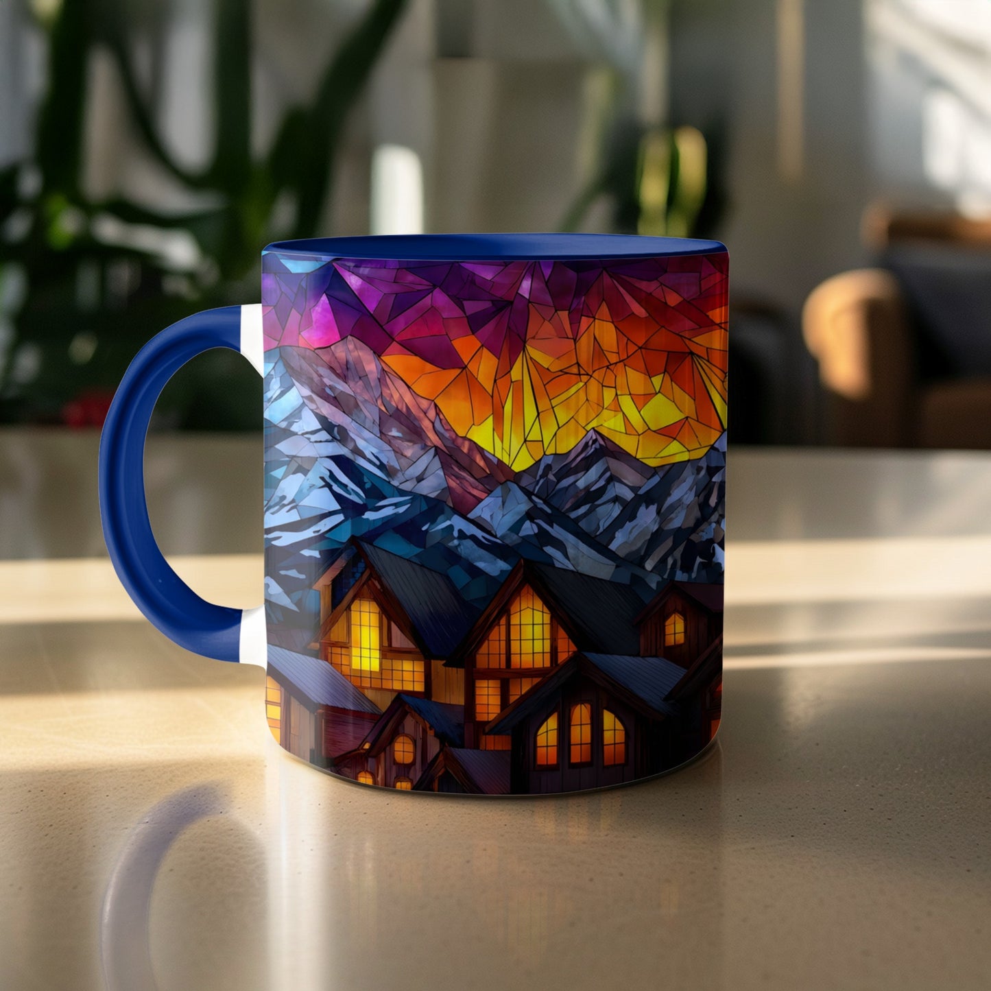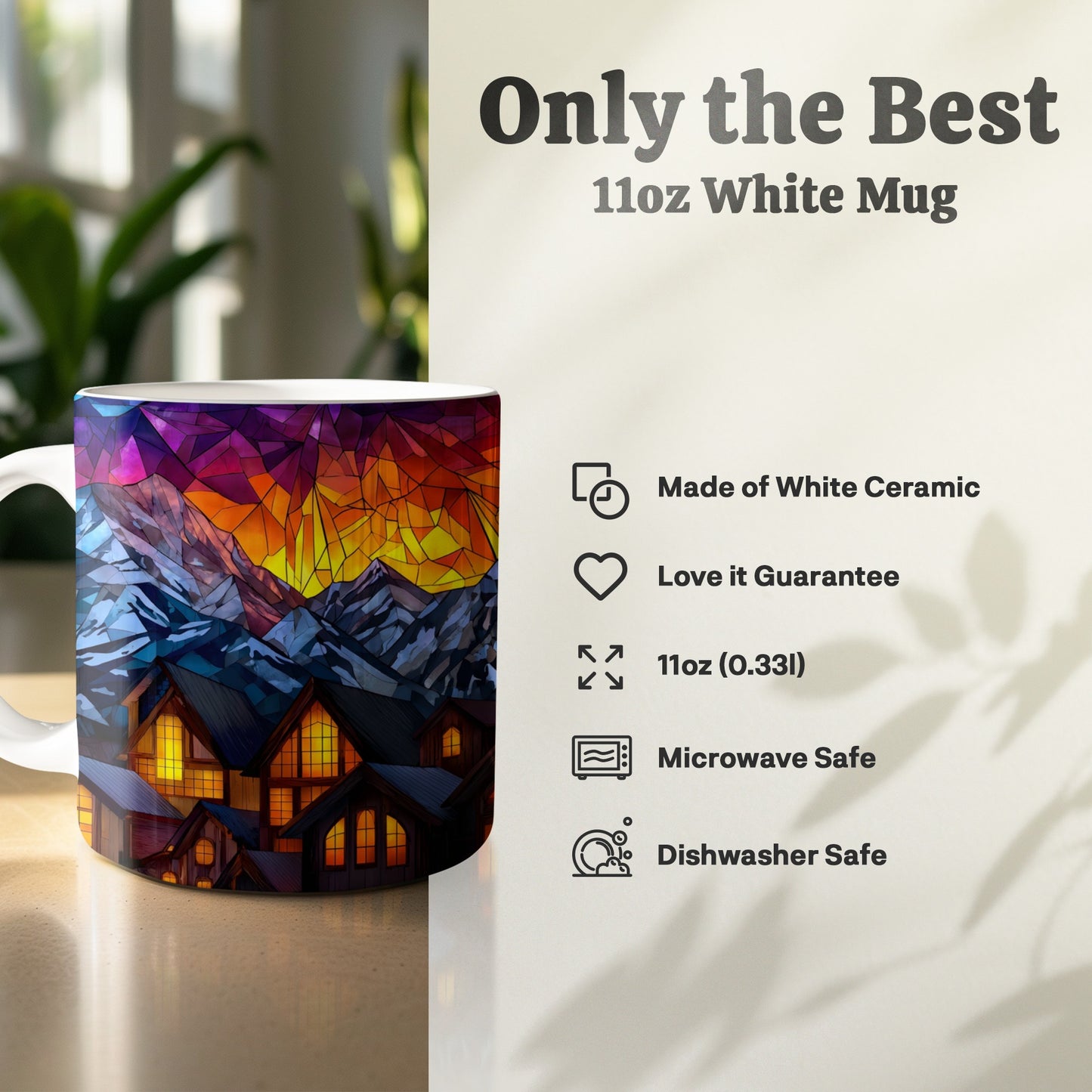 Get lost in this amazing stained glass scenery featuring glowing town nestled below majestic mountains during a radiant sunset. This unique scenery will spark creativity.