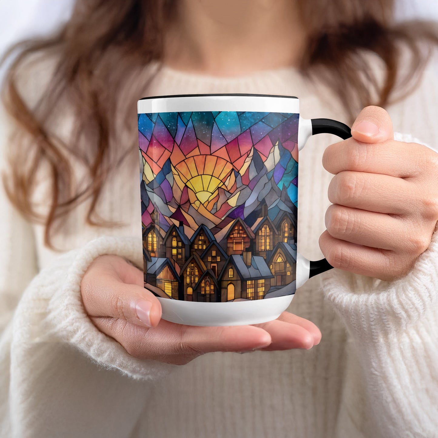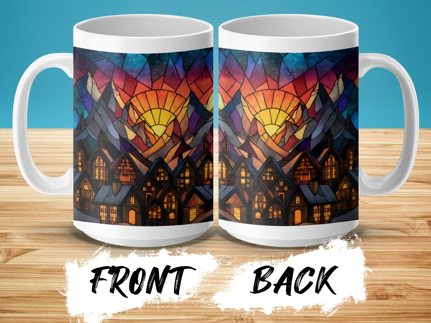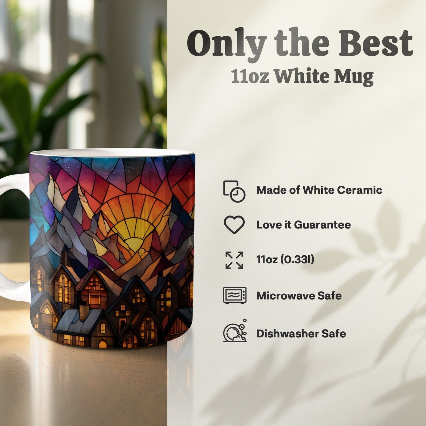 Evoke timeless beauty featuring stained glass artwork of a quaint village against the backdrop of a breathtaking sunset. Discover elegance with our digital art!