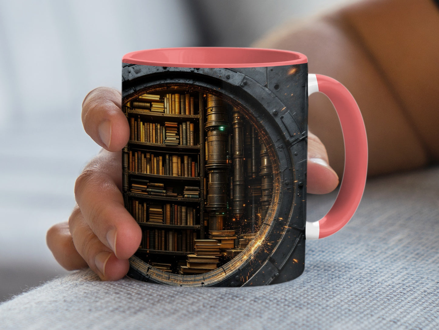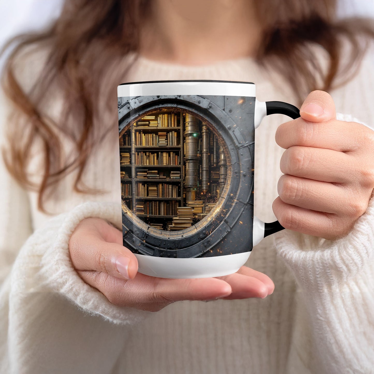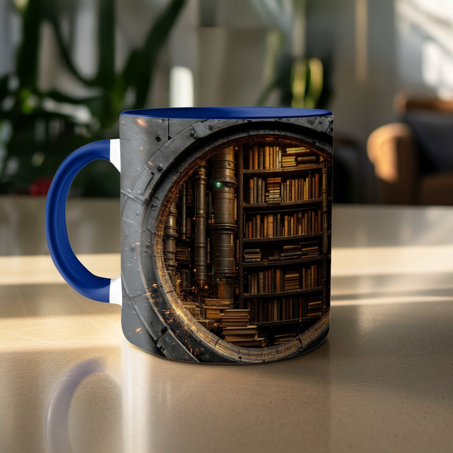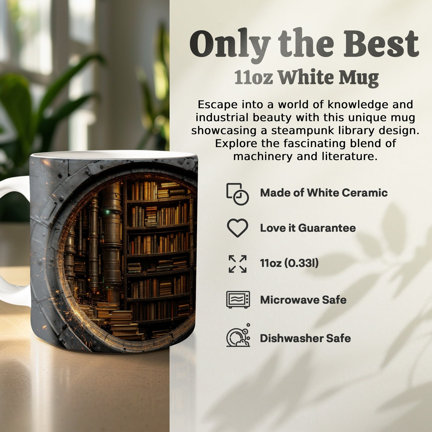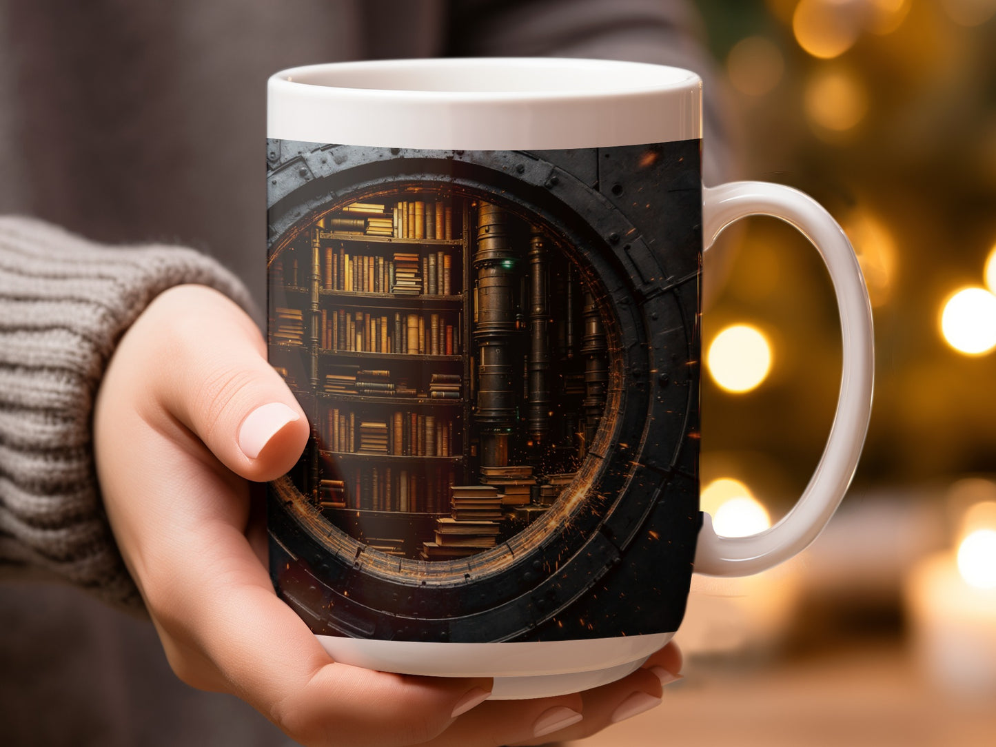 Steampunk Library Behind Metal Portal Bookshelves Design Mug