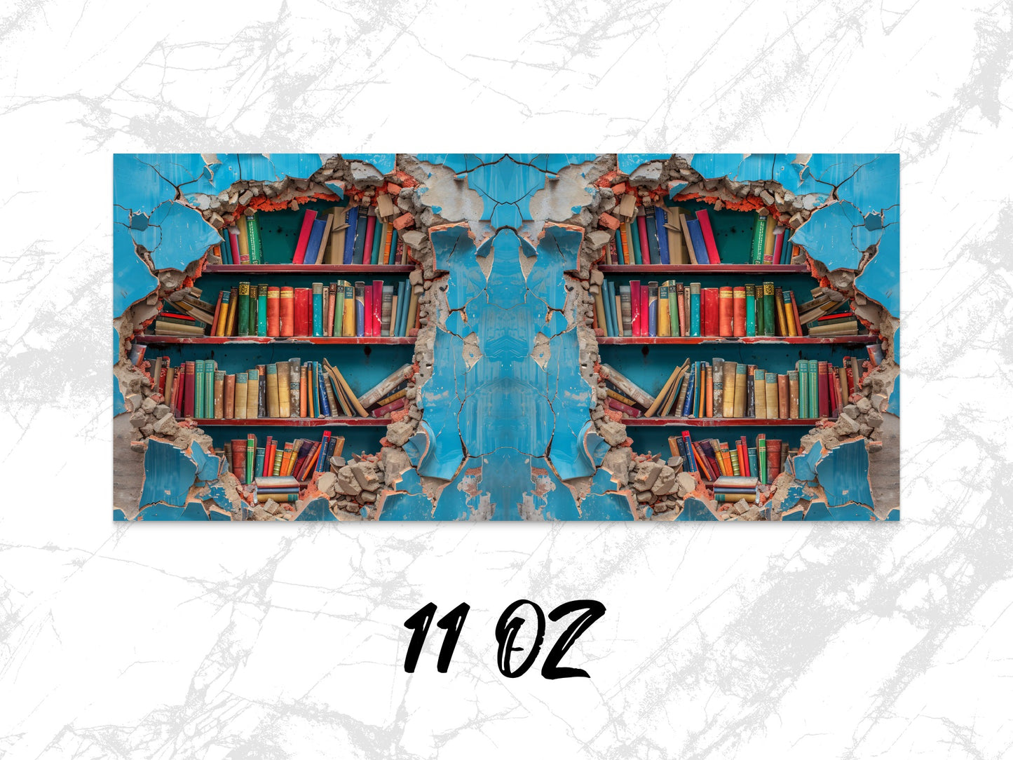 Download this image featuring a bookshelf in symmetrical presentation behind a cracked wall. Ideal for backgrounds. Get the perfect aesthetic with a destroyed library Digital.