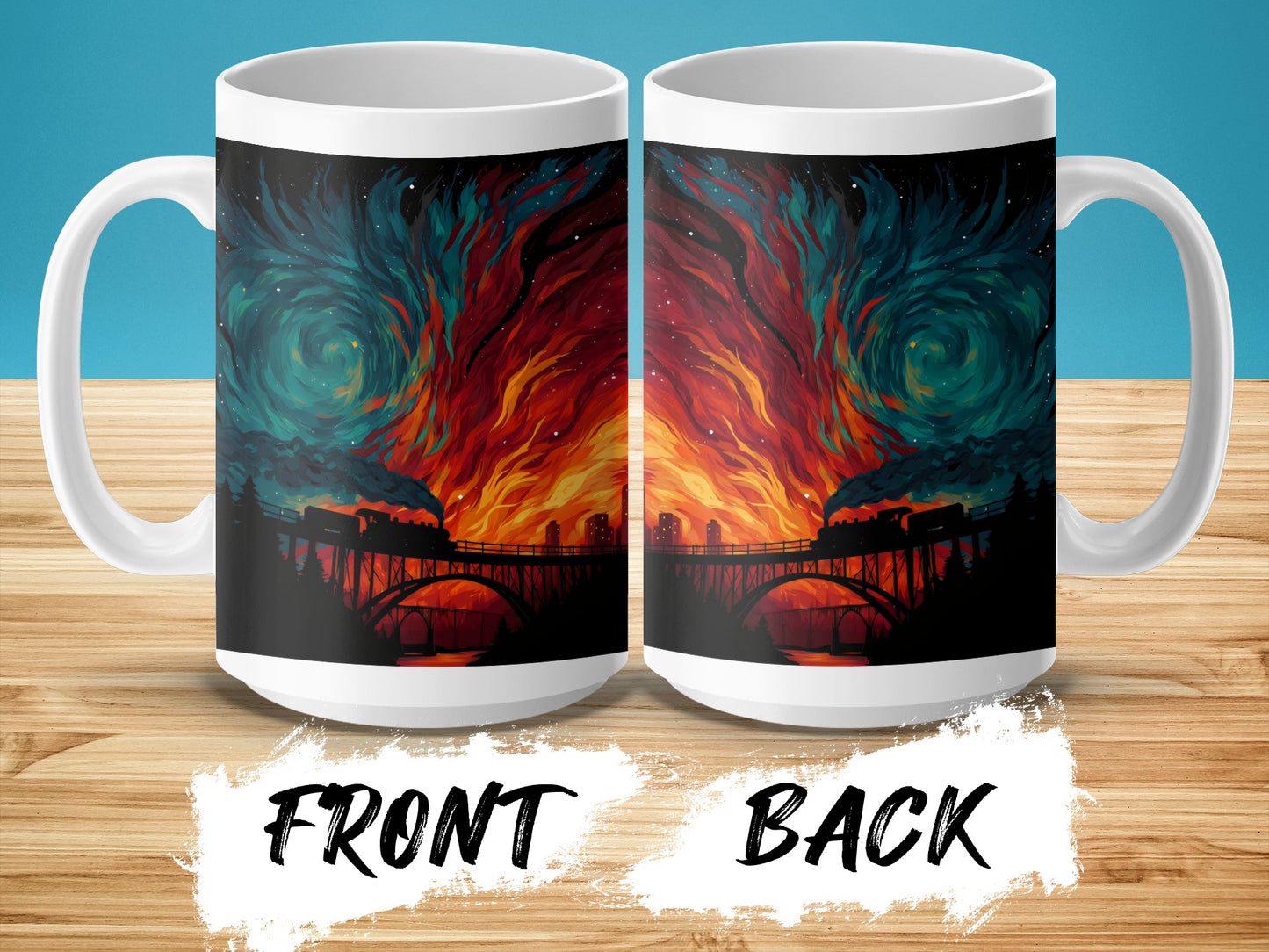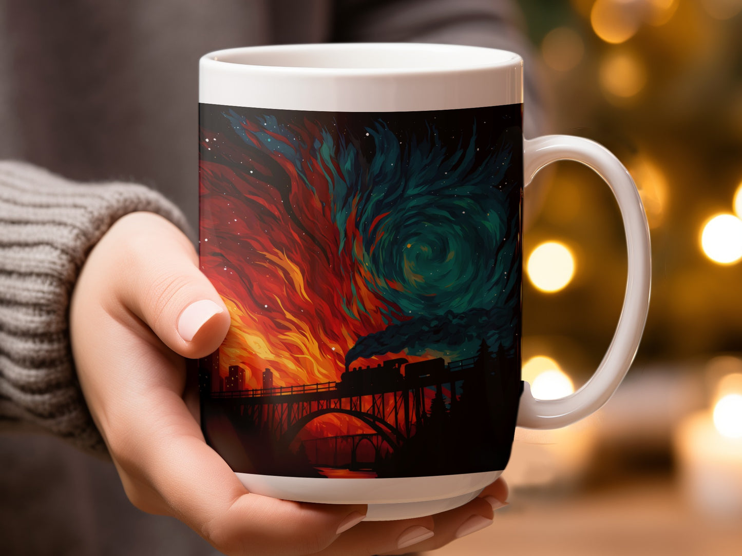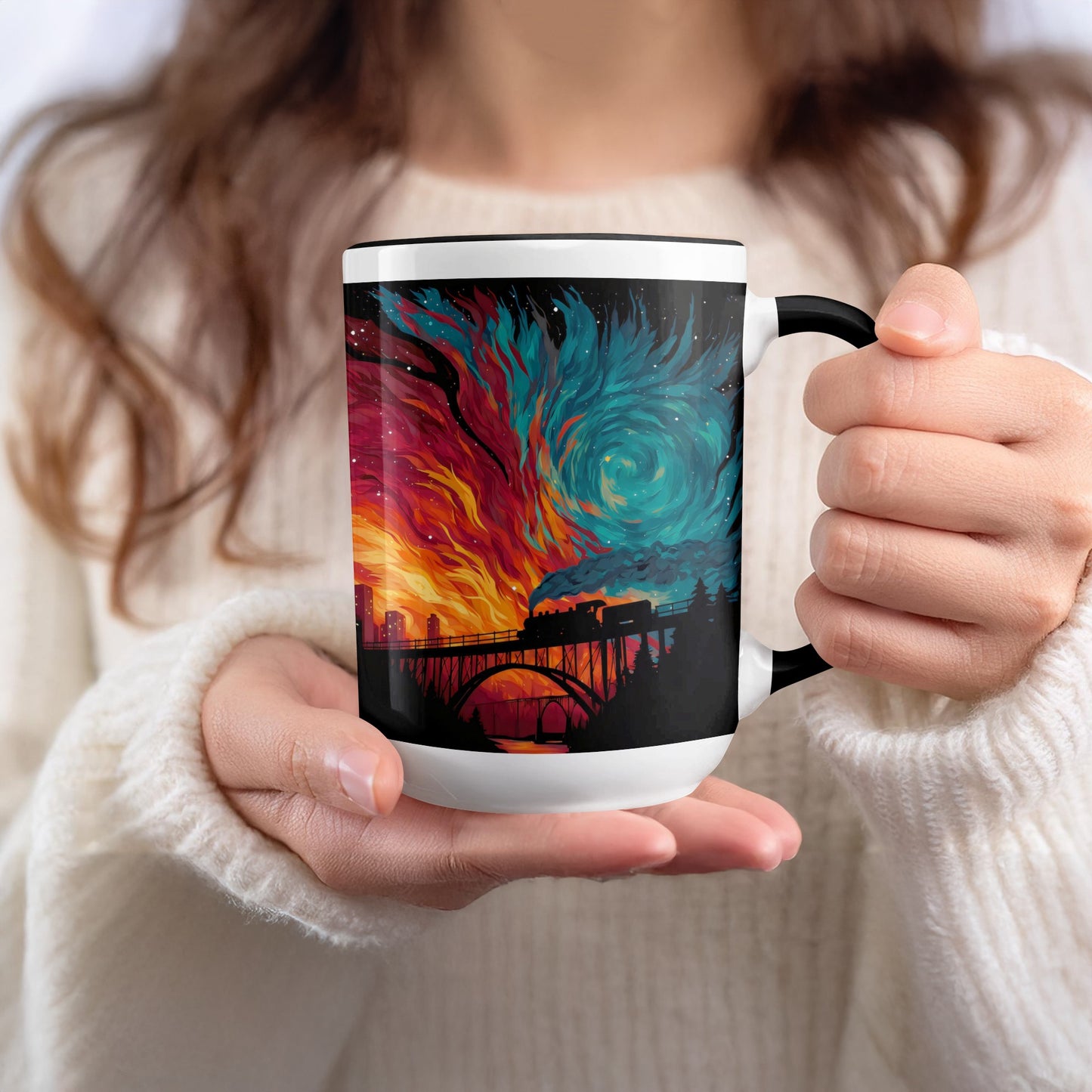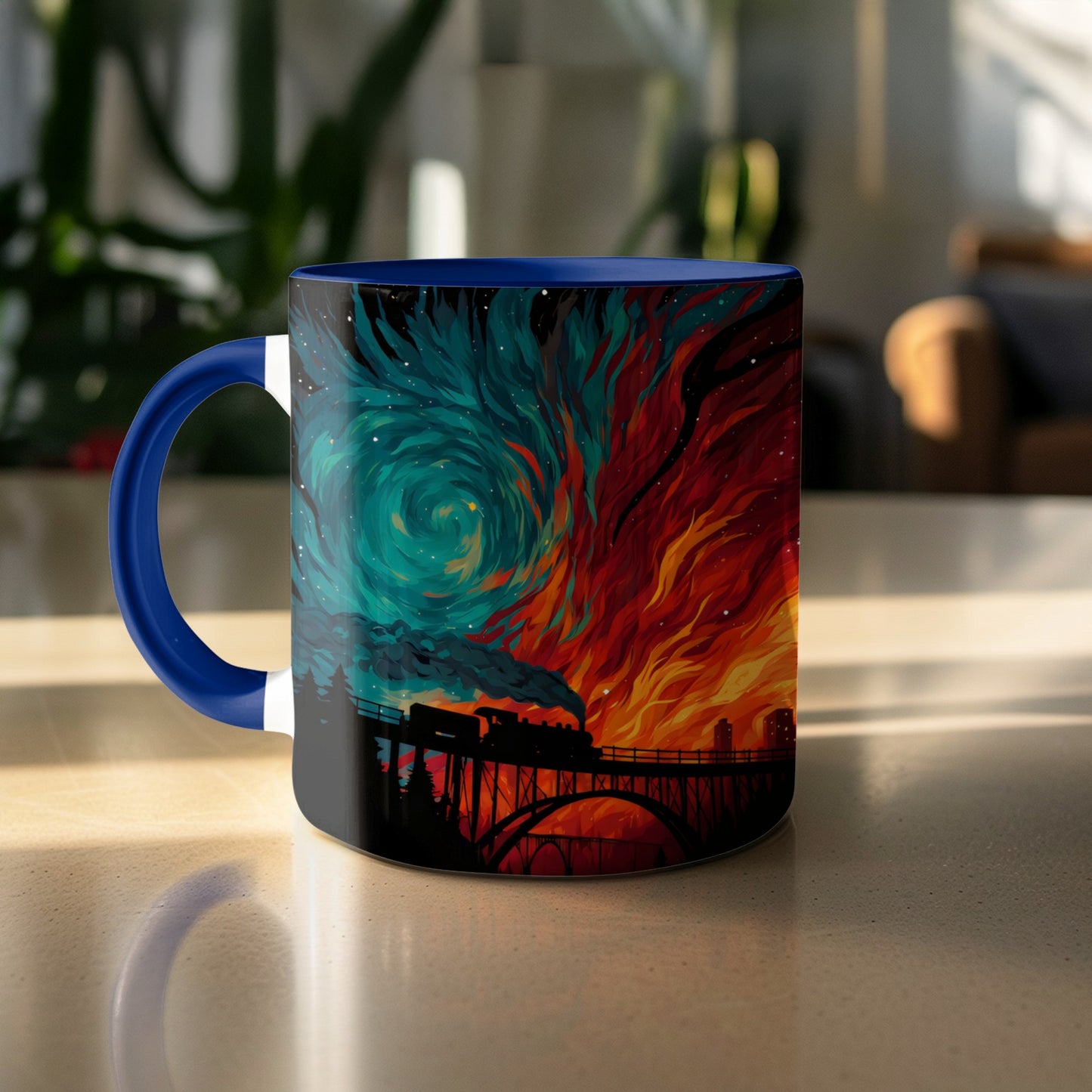 Train on Bridge Dividing Skies Artwork Illustration Mug