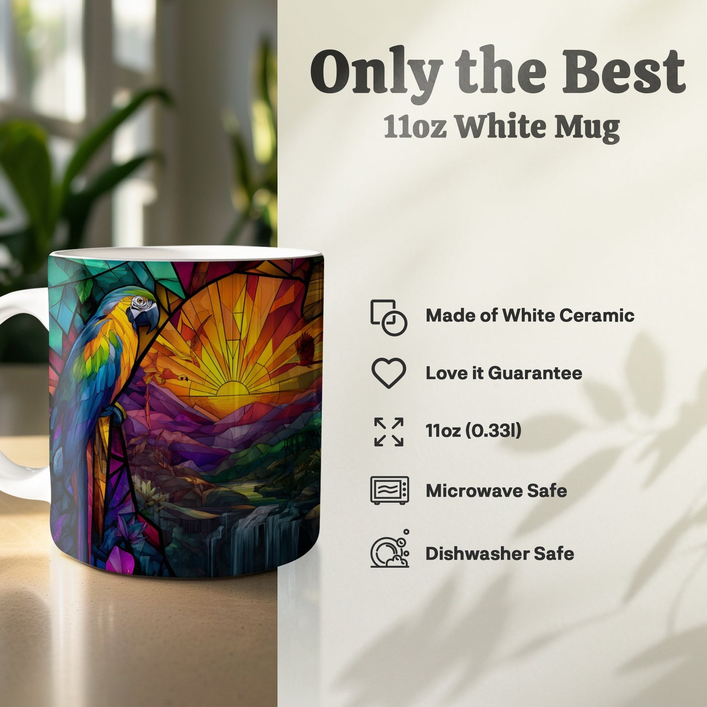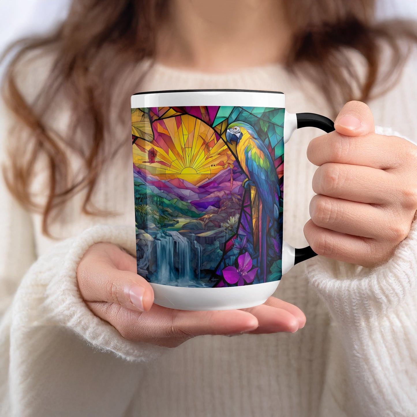 Tropical Stained Glass Design Macaw Parrot Waterfall Digital