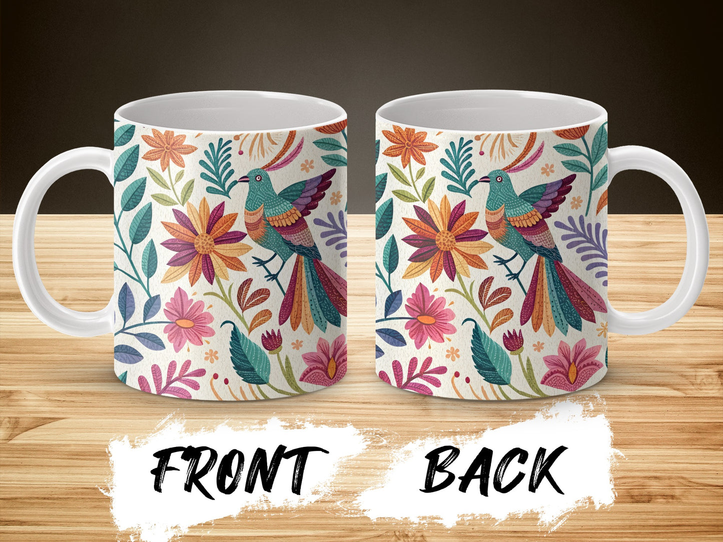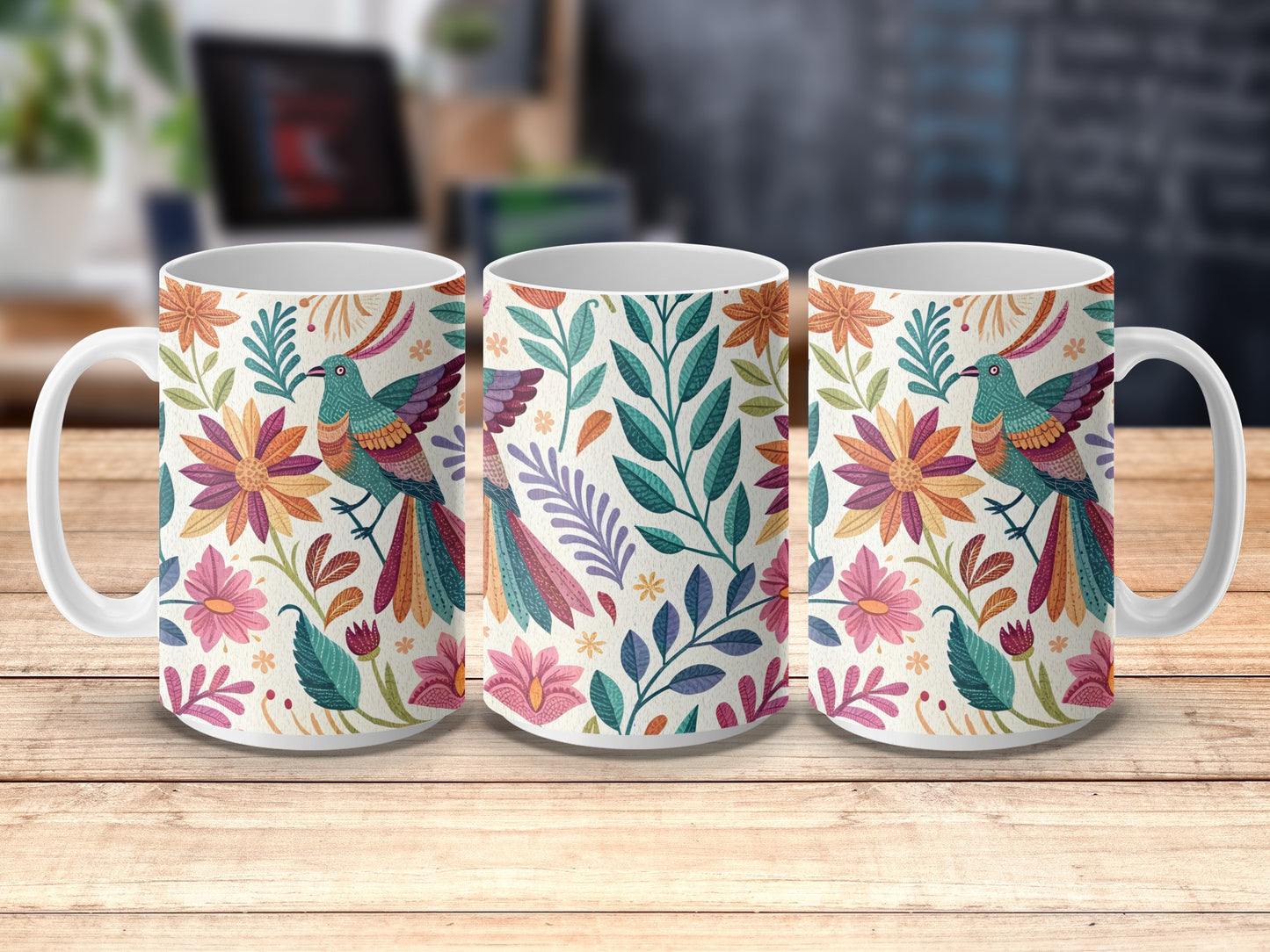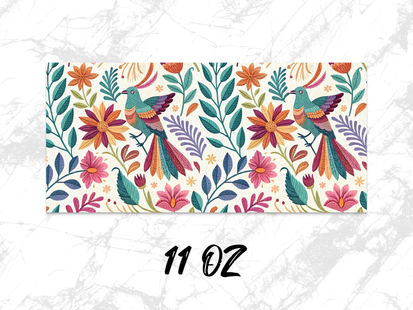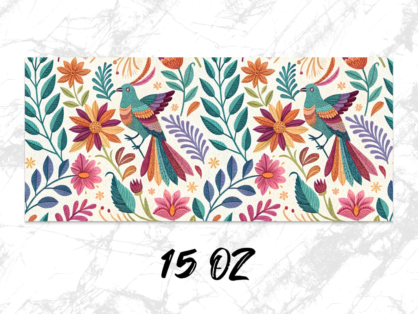 This digital product showcases a vibrant otomi embroidery design featuring whimsical birds nestled among colorful flowers and lush foliage. Perfect for creative projects needing a folk art touch.