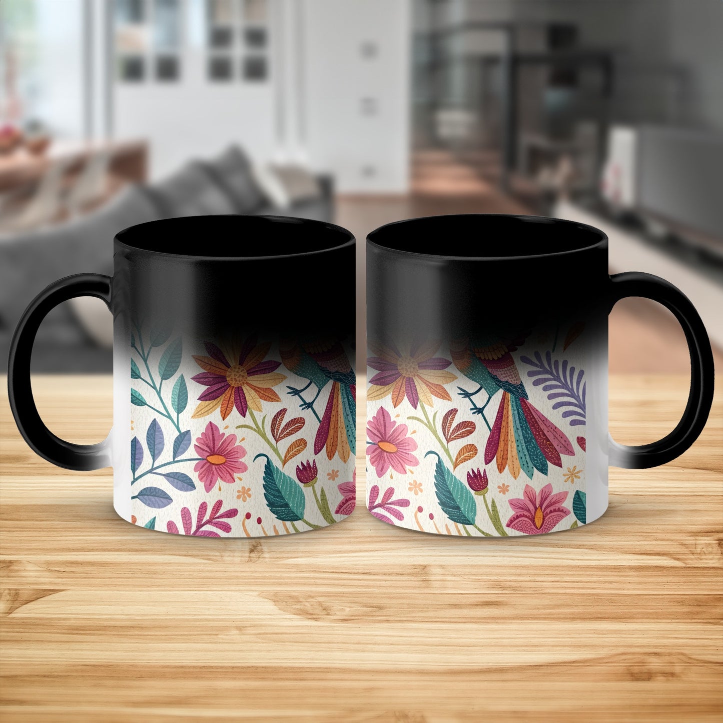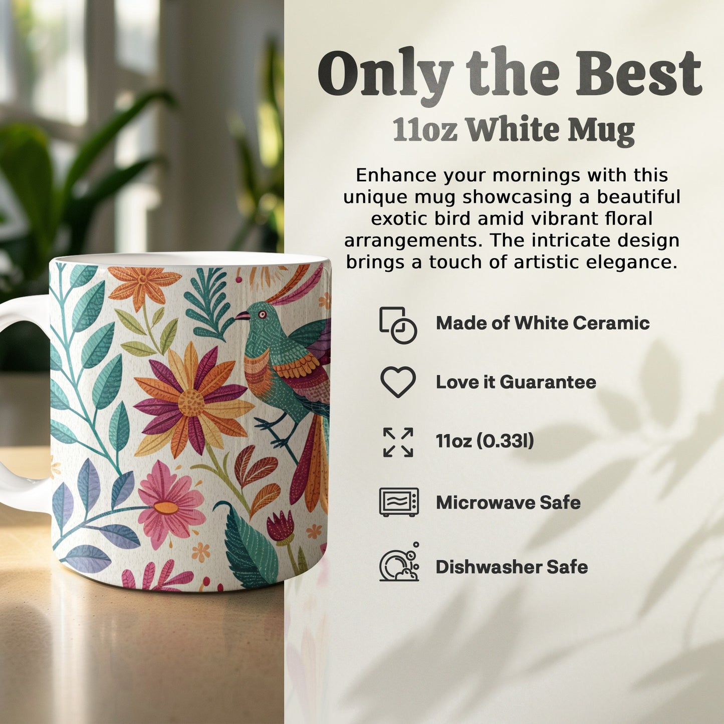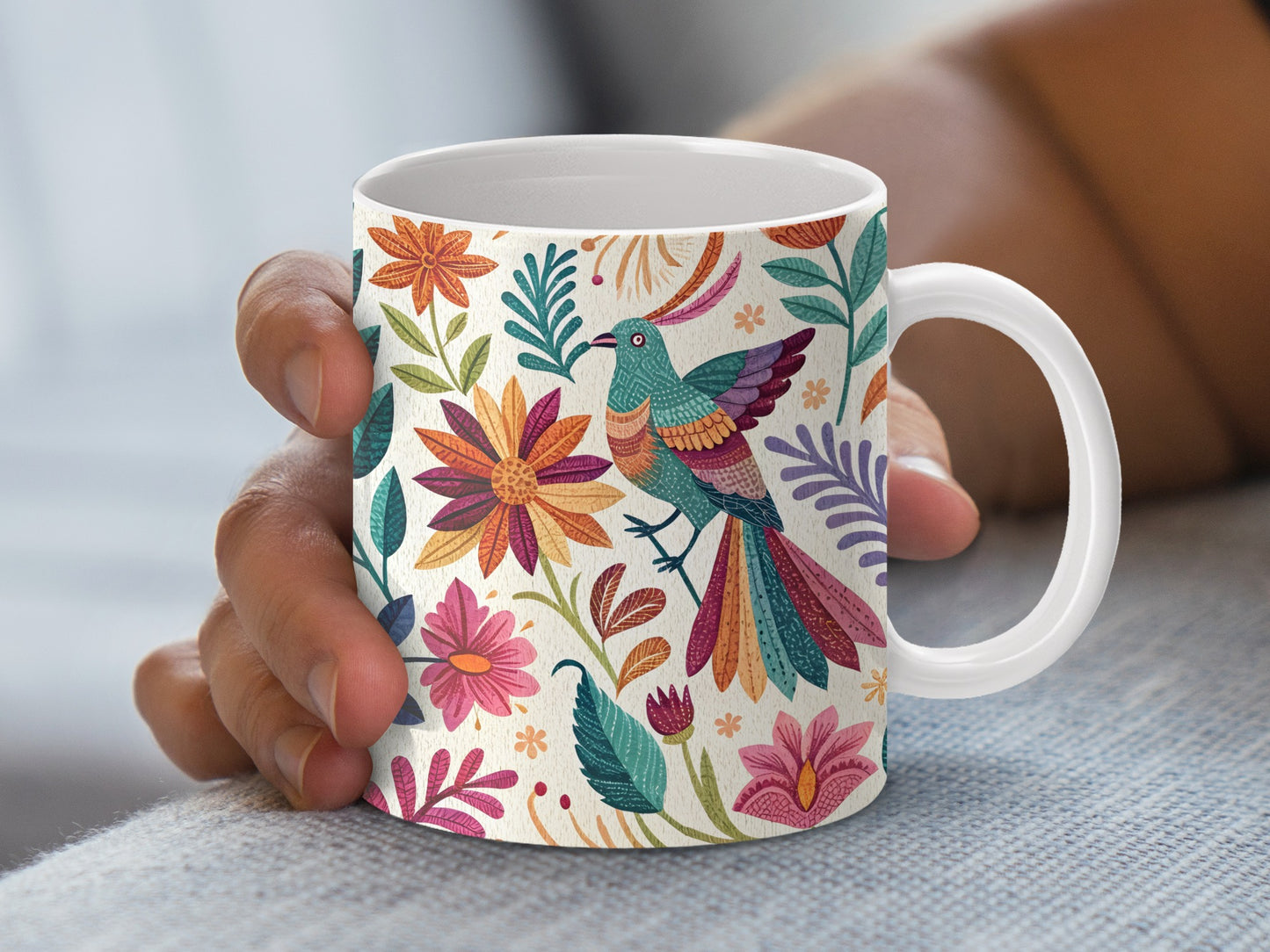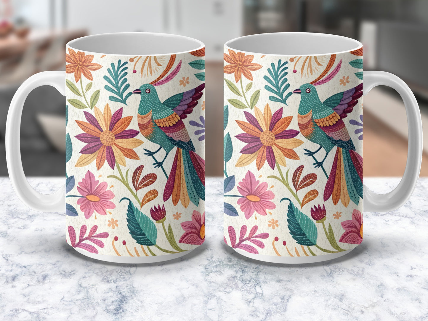 This digital product showcases a vibrant otomi embroidery design featuring whimsical birds nestled among colorful flowers and lush foliage. Perfect for creative projects needing a folk art touch.